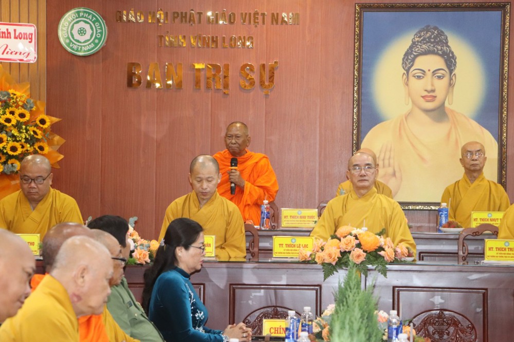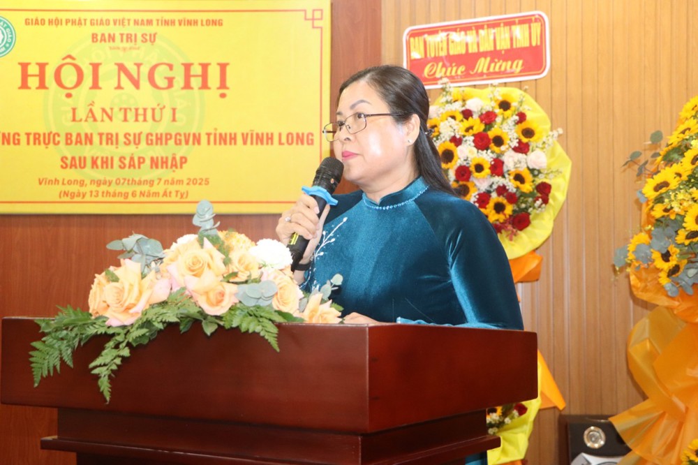 Đại diện Lãnh đạo tỉnh phát biểu, Bà Nguyễn Thị Minh Trang – Ủy viên Ban Thường vụ Tỉnh ủy, Trưởng Ban Tuyên Giáo và Dân Vận Tỉnh ủy Vĩnh Long bày tỏ: “Từ những ngày đầu thành lập, Đảng bộ và Chính quyền tỉnh Vĩnh Long xác định rõ sự nghiệp phát triển bền vững tỉnh nhà không thể tách rời sự đồng hành của các tổ chức Tôn giáo. Trong đó Phật giáo giữ vai trò hết sức quan trọng, giáo hội Phật giáo không chỉ là nơi hướng dẫn đời sống tâm linh mà còn là nguồn lực tinh thần, trí tuệ góp phần xây dựng đạo đức xã hội, lan tỏa giá trị yêu thương, đoàn kết vị tha và trách nhiệm cộng đồng. Hội nghị hôm nay là dịp để chúng ta cùng nhìn lại chặng đường đã qua, đồng thời xác lập phương hướng, tổ chức nhân sự Ban Trị sự mới để giáo hội Phật giáo tỉnh Vĩnh Long thực sự trở thành một thể thống nhất, đoàn kết, hòa hợp, trí tuệ, kỷ cương, kế thừa tinh hoa từ các Ban Trị sự tiền thân đóng góp xứng đáng vào sự nghiệp phát triển quê hương…”.