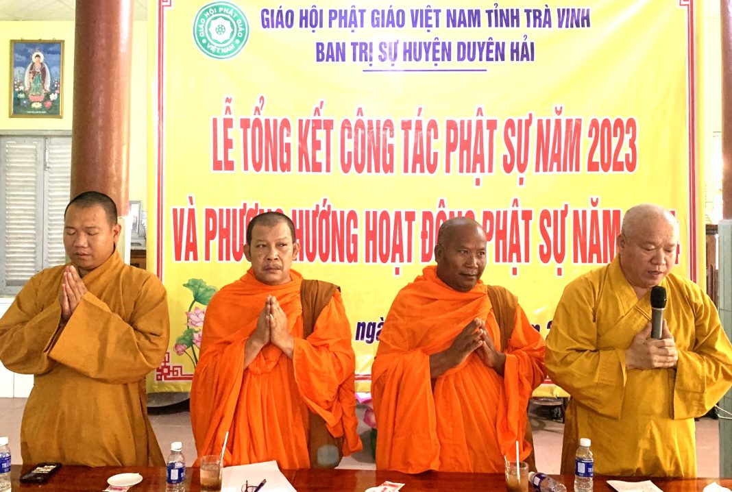 Sau khi tuyên bố lý do và giới thiệu thành phầm tham dự, Thượng tọa Thích Phước Hạnh – Phó trưởng Ban thường trực BTS GHPGVN huyện, phát biểu chào mừng quý đại biểu và tuyên bố Khai mạc Hội nghị. Theo đó, Thượng tọa Thạch Sê Tha – Phó Thư ký kiêm Chánh Văn phòng BTS GHPGVN huyện Duyên Hải, đại diện cho Ban Thư ký Phật giáo huyện, thông qua báo cáo công tác Phật sự năm 2023 và phương hướng hoạt động Phật sự năm 2024 của BTS GHPGVN huyện Duyên Hải. Toàn huyện có 20 chùa Phật giáo, trong đó có 14 chùa Nam tông, 6 chùa Bắc tông, có 35.647 tín đồ Phật tử. Ban Trị sự huyện, đã tập hợp toàn thể Chư Tăng – Ni, Phật tử đoàn kết sống trên tinh thần theo phương châm “Đạo pháp, dân tộc, chủ nghĩa xã hội”. Bà con Phật tử trong huyện luôn tin tưởng vào sự Lãnh đạo của Đảng và Chánh quyền các cấp. Tuân thủ hệ thống tổ chức dưới sự lãnh đạo của Giáo hội Phật giáo Việt Nam, chỉ đạo của BTS GHPGVN tỉnh Trà Vinh. BTS Phật giáo huyện luôn nghiêm túc triển khai các nội dung của Hiến chương và Nội quy Ban Tăng sự GHPGVN, Thông bạch, Thông tư về Phật đản, An cư Kiết hạ và Nghị quyết Đại hội IV của Ban trị sư đến các tự viện trong huyện. Công tác trọng tâm là các ngày lễ lớn, được thống nhất trang nghiêm và trọng thể, tiết kiệm đúng theo tinh thần của GHPGVN quy định. Hệ phái Bắc tông: có 6 chùa, chư Tăng: có 10 vị (Hoà thượng 01 vị, Thượng tọa 01 vị, Tỳ kheo 07 vị), chư Ni: có 33 vị (Ni sư 01 vị, Tỳ kheo ni 10 vị, Thức xoa ma na ni 05 vị, sa di ni 15 vị). Hệ phái Nam tông Khmer: có 14 chùa: Sư sãi 379 vị (Hoà thượng 4 vị; Thượng toạ 6 vị; Trụ trì 14 vị, phó Trụ trì 09 vị; Tỳ khưu 127 vị; Sa di 219 vị và 398 Ban quản trị). Về hoạt động giáo dục: Hệ phái Bắc Tông có 04 vị đang học trường Trung cấp Phật học Trà Vinh. Hệ phái Nam Tông Khmer hiện có 15 lớ Sơ cấp Phật học, có 275 Tăng thanh niên sinh theo học. Các Ban ngành trực thuộc như: Hoằng pháp; Văn hóa; Nghi lễ… Luôn phát triển đồng bộ và hoàn thành tốt các công tác Phật sự trong năm qua. Đặc biệt là công tác từ thiện trong năm 2023 của BTS GHPGVN huyện, tổng là 6.327.000.000 đồng.