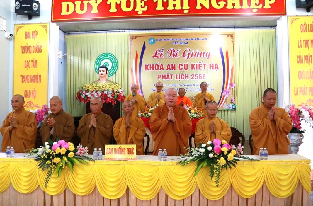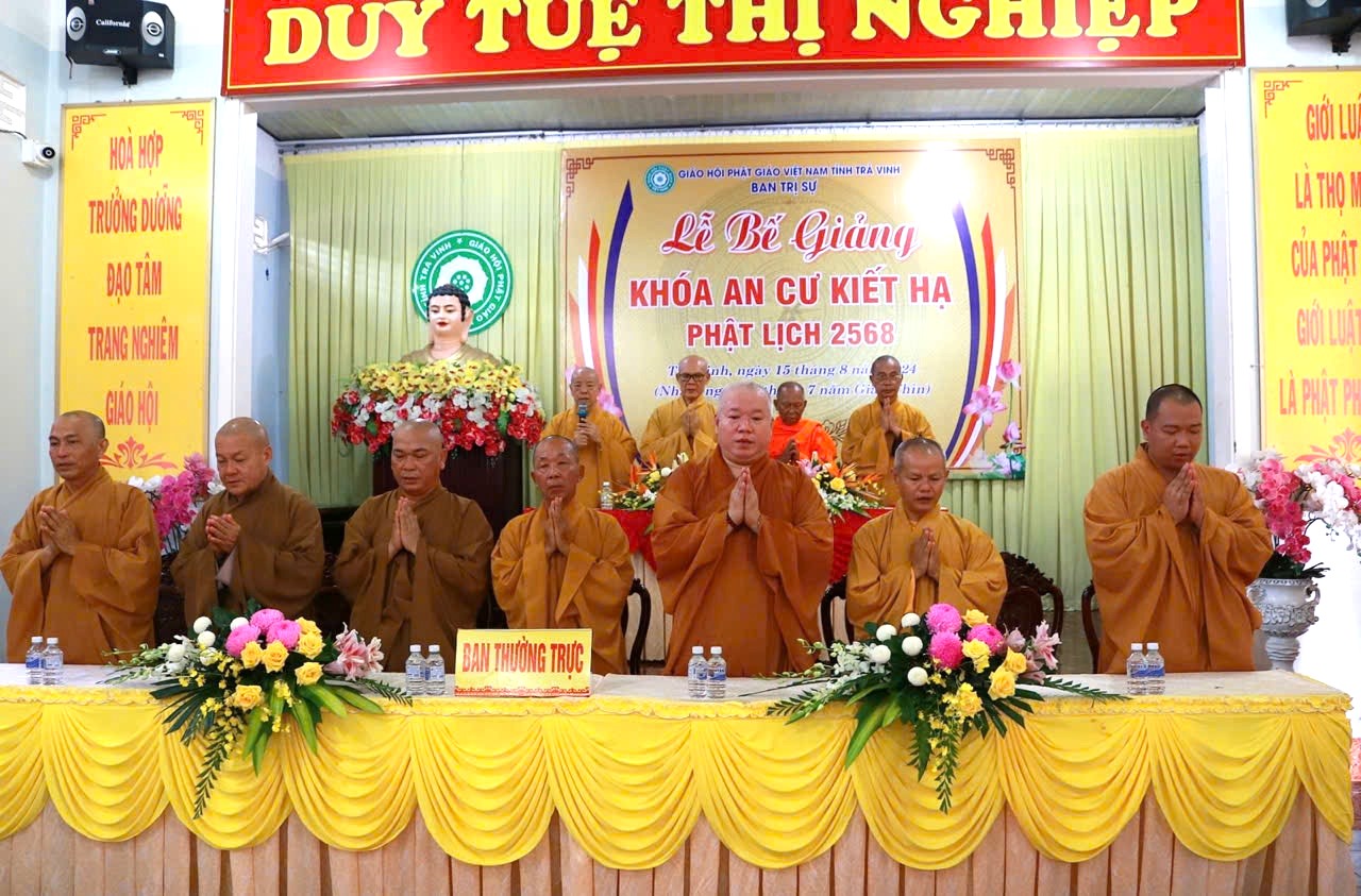 Sau đó, HT. Thích Trí Minh phát biểu khai mạc, ĐĐ. Thích Minh Trí – Phó Thư ký kiêm Chánh văn phòng đã báo cáo tổng kết khóa An cư kiết hạ PL.2568 và công bố quyết định thành lập Ban Cố vấn và bổ sung Ủy viên Phân ban Ni giới thuộc Ban Tăng sự BTS GHPGVN tỉnh Trà Vinh nhiệm kỳ VII (2022-2027). Theo đó, khóa An cư kiết hạ Phật lịch 2568 do BTS GHPGVN tỉnh Trà Vinh tổ chức khai giảng từ ngày 16/4 năm Giáp Thìn đến 12/7 năm Giáp Thìn, tại 2 trường hạ là: trường hạ Tăng – chùa Lưỡng Xuyên (P.1, TP.Trà Vinh) và trường hạ Ni – chùa Liên Hoa (P.5, TP.Trà Vinh), tổng số hành giả an cư tại 2 điểm là 320 vị (trong đó, Tăng 156 vị, Ni 164 vị). Trong suốt thời gian 3 tháng an cư, chư Tăng Ni hành giả thực hiện theo chương trình, nội quy do Ban chức sự đề ra một cách nghiêm túc, luôn nỗ lực, tinh tấn tu học, thực hiện đúng các quy định của hạ trường, thúc liễm thân tâm, trau dồi Giới – Định – Tuệ.