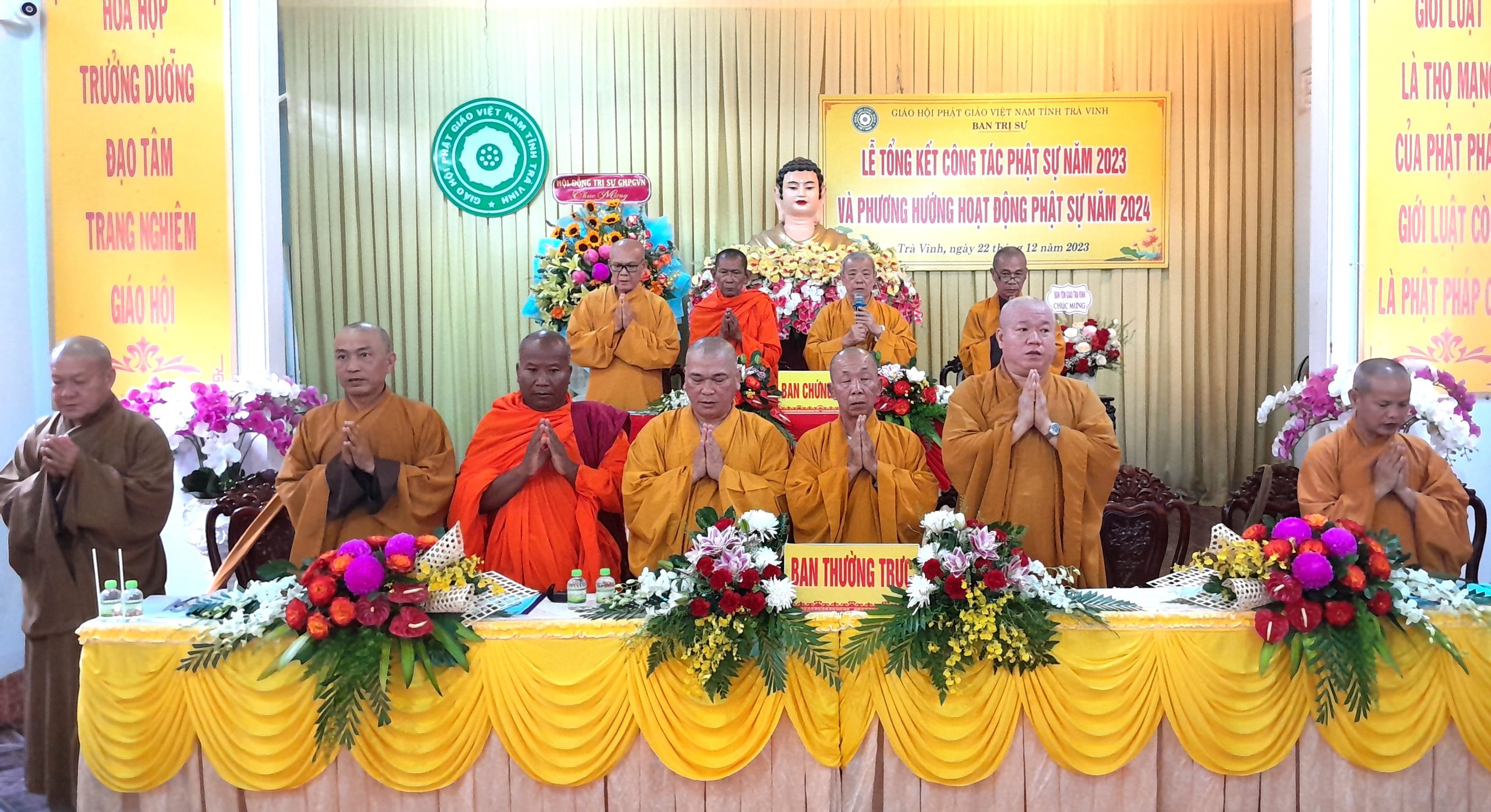 Sau lời phát biểu khai mạc của TT. Thích Tâm Khiết, Phó ban kiêm Chánh Thư ký BTS Phật giáo tỉnh, ĐĐ. Thích Minh Hải – Phó Chánh văn phòng BTS Phật giáo tỉnh, đã báo cáo tổng kết khóa bồi dưỡng và công tác Phật sự trong năm 2023 toàn tỉnh có: 264 cơ sở tự viện, số lượng tu sĩ: 3.557 vị, có khoảng 450.000 tín đồ Phật tử, Ban Trị sự GHPGVN tỉnh Trà Vinh nhiệm kỳ VII (2022 – 2027) gồm có 63 thành viên (đã viên tịch 1 thành viên), 23 Ủy viên Thường trực, có 12 Ban trực thuộc. Được sự chỉ đạo của Trung Ương Giáo hội, sự lãnh đạo của chư Tôn đức Ban Trị sự Phật giáo tỉnh, sự quyết tâm đồng lòng của Tăng Ni trong tỉnh nên các công tác Phật sự đạt được về Tăng sự, Giáo dục, Văn Hóa, Hoằng Pháp,… đặc biệt nhất về công tác từ thiện xã hội như: xây cầu, đường, tặng tập viết, xe đạp, học bổng cho học sinh nghèo,…Với tổng kinh phí trên 94 tỷ đồng.