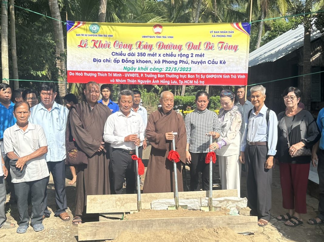 Sáng ngày 22/5/2023 (nhằm ngày 4/4 năm Quý Mão) Ban Trị sự GHPGVN tỉnh Trà Vinh phối hợp cùng UBMTTQVN tỉnh và chính quyền địa phương tổ chức Lễ khởi công xây dựng cầu Giao thông nông thôn và Đường Đal Bê-tông tại 2 (ấp Đồng Khoen, ấp 4, xã Phong Phú, huyện Cầu Kè, tỉnh Trà Vinh).