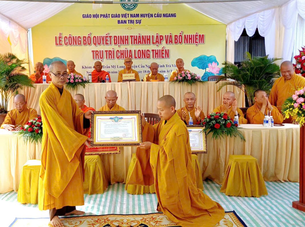 Tại buổi lễ, Hòa thượng Thạch Sok Xane trao Quyết định thành lập chùa Long Thiền đến Thường trực BTS. GHPGVN huyện Cầu Ngang; Hòa thượng Thích Huệ Pháp trao Quyết định Bổ nhiệm Trụ trì cho Đại đức Thích Như Thiện.