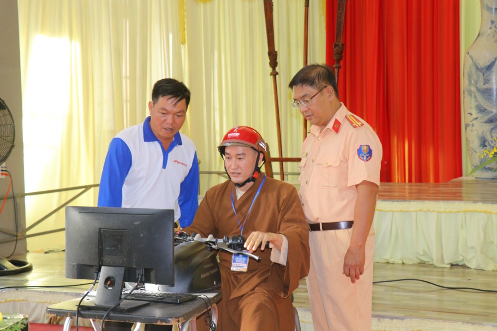 Tham dự buổi tuyên truyền pháp luật giao thông và hướng dẫn kỹ năng lái xe an toàn, chư Tăng Ni không chỉ được giao lưu, trao đổi và giải đáp thắc mắc trực tiếp cùng cán bộ chuyên môn, mà còn được trải nghiệm thực hành kỹ năng lái xe an toàn trên mô hình mô phỏng ART – một hình thức tập luyện sinh động, giúp ghi nhớ kiến thức hiệu quả hơn.