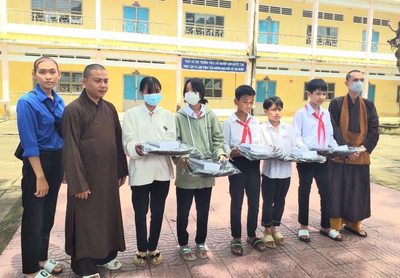 Đại đức Thích Thiện Hạnh đã thay mặt quý Phật tử trao tặng 100 phần quà này đến trường Trung học Cơ sở Lưu Nghiệp Anh tại ấp Chợ, xã Lưu Nghiệp Anh và tặng 100 phần quà cho trường Trung học Cơ sở Kim Sơn tại ấp Trà Cú A, xã Kim Sơn.