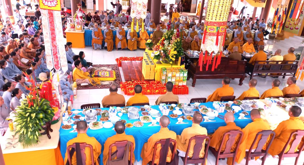 Sau lời đạo từ, chư Tôn đức hệ phái Nam Tông tụng kinh chúc phúc đến toàn thể hội chúng. Kế đến, Thượng tọa Thích Minh Nhựt – Trưởng ba Nghi lễ GHPGVN Tỉnh, đương vi sám chủ, thực hiện nghi thức quá đường, tụng Kinh Vu lan để toàn thể Phật tử nhiễu Y và dâng lên cúng dường, buổi lễ đã khép lại, nhưng tình thương và niềm hiếu hạnh luôn dâng trào trong lòng mọi người tham dự.