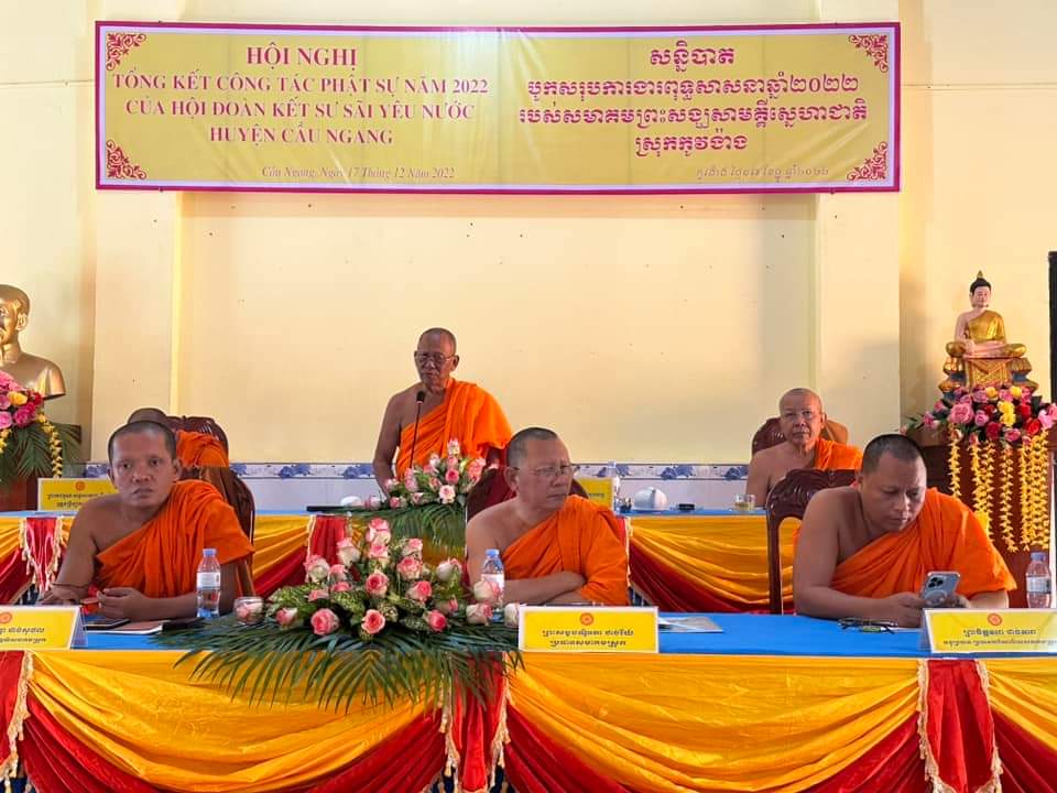Ban Giáo dục Phật học huyện, trụ trì các chùa tổ chức mở 115 lớp ngữ văn Khmer từ lớp 1 đến lớp 5, có 2.264 Tăng sinh theo học, lớp sơ cấp Phật học từ lớp 6 – 9 mở được 16 lớp, có 229 Tăng sinh, lớp trung cấp Phật học từ lớp 10 -12 mở được 2 lớp, có 56 Tăng sinh. Thường trực Hội ĐKSSYN huyện giới thiệu 111 vị Tăng sinh đến Ban Giáo dục Phật học tỉnh theo học các lớp Pali, thực hiện tốt công tác hoằng pháp và tuyên truyền pháp luật, công tác tổ chức hội ngày một nâng cao. Huyện hội vận động chư Tăng, Phật tử tích cực tham gia tốt các phong trào thi đua yêu nước, nhất là phong trào xây dựng xã nông thôn mới, huyện nông thôn mới. Đặc biệt, trong năm 2022 Hội ĐKSSYN huyện thực hiện tốt công tác từ thiện xã hội với tổng số tiền hơn 3,5 tỷ đồng. Phương hướng hoạt động trong 2023, Hội tiếp tục thực hiện tốt công tác tu học và hoằng pháp, đẩy mạnh công tác giáo dục – đào tạo cho chư Tăng và con em phật tử, thực hiện tốt công tác văn hóa – xã hội, từ thiện xã hội. Chuẩn bị nhân sự tổ chức Đại hội Hội ĐKSSYN huyện Cầu Ngang nhiệm kỳ VII (2023 – 2028). Ban đạo từ tại Hội nghị, HT. Thạch Sok Xane, Chủ tịch Hội ĐKSSYN tỉnh, phấn khởi biểu dương những kết quả Hội ĐKSSYN huyện Cầu Ngang đạt được năm 2022. Hòa thượng mong muốn Huyện hội tiếp tục nêu cao tinh thần đoàn kết, nỗ lực hoàn thành tốt các nhiệm vụ đề ra trong năm 2023, nhất là công tác Hoằng pháp gắn với tuyên truyền pháp luật, công tác từ thiện xã hội và chuẩn bị tốt cho Đại hội Hội ĐKSSYN huyện Cầu Ngang nhiệm kỳ VII (2023-2028).