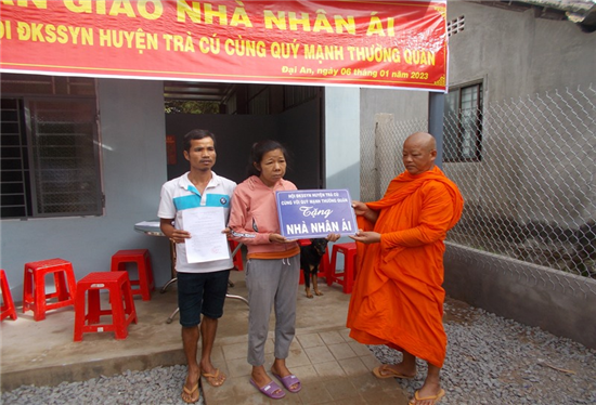 Ngày 6/1/2023 ( nhằm ngày 15/12 năm Nhâm Dần ) nhân dịp Xuân Quý Mão năm 2023 gần đến, TT. Trương Văn Biển – Ủy viên Ban Trị sự GHPGVN tỉnh Trà Vinh, Phó chủ tịch Hội ĐKSSYN huyện Trà Cú kết hợp cùng chính quyền địa phương tổ chức Lễ trao tặng nhà Nhân ái cho gia đình bà Vi Thị Hóa tại ( ấp Giồng Lớn A, xã Đại An, huyện Trà Cú, tỉnh Trà Vinh ).
