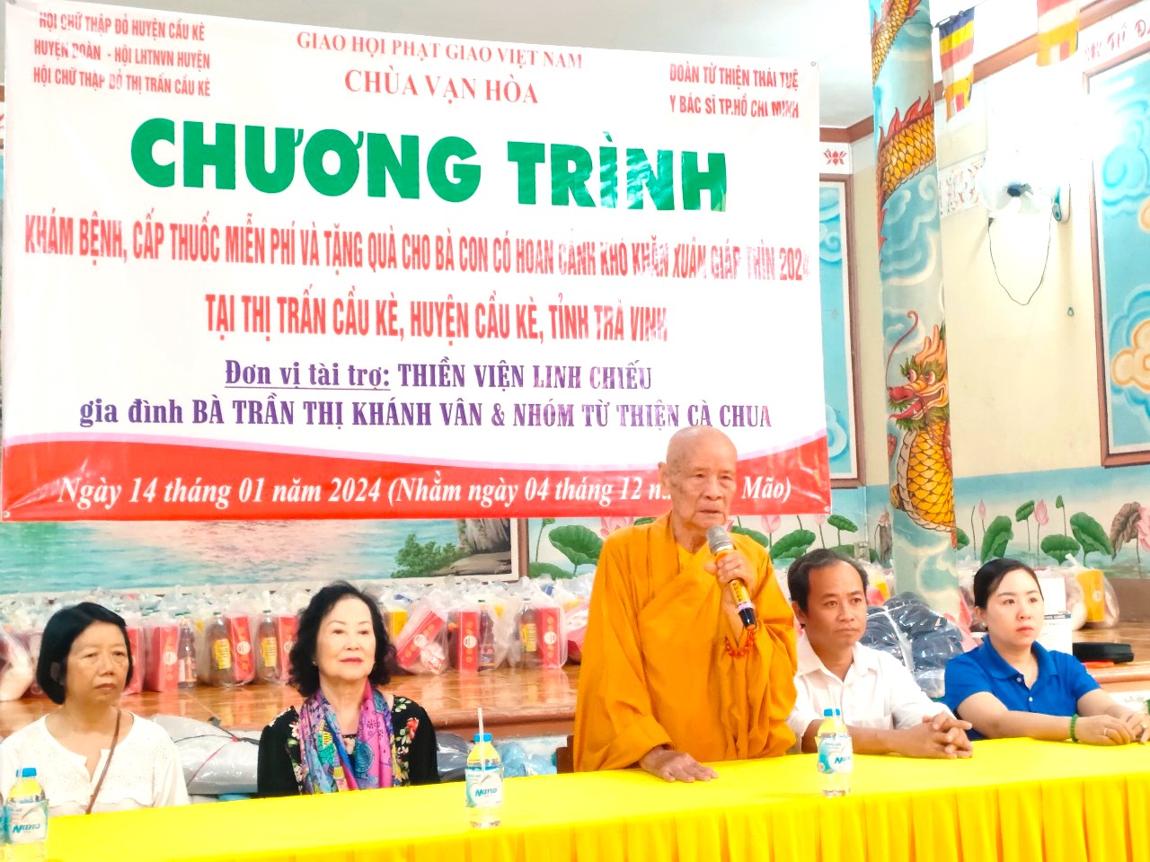 Ngày 14/01/2024 (Nhằm 04/12/năm Quý Mão) chùa Vạn Hòa kết hợp cùng với Thiền viện Linh Chiếu – Nhóm Thiện Nguyện Cà Chua TP.HCM – Gia đình bà Trần Thị Khánh Vân tổ chức buổi Khám Bệnh cấp thuốc và trao tặng 400 phần quà cho bà con có hoàn cảnh khó khăn trên địa bàn thị trấn Cầu Kè, tỉnh Trà Vinh, do Đại đức Thích Thiện Lộc vận động và kêu gọi tổ chức.
