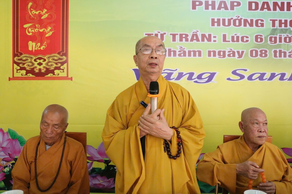 Thay mặt chư Tôn đức Ban chứng minh, HT.Thích Nhựt Tấn – Ủy viên Thường trực HĐTS, Chứng minh BTS GHPGVN tỉnh Vĩnh Long ban đạo từ tán thán sự hiếu đạo của toàn thể tang gia hiếu quyến. Hòa thượng nhấn mạnh: Trong tinh thần hiếu đạo đó, chúng ta đã hiểu Đức Phật có dạy rằng “Tâm hiếu là tâm Phật, Hạnh hiếu là hạnh Phật” cho nên toàn thể liệt quý vị đã thực hành hạnh hiếu đó là cần cầu Tam bảo, noi theo gương chí hiếu Mục Kiền Liên tôn giả. Trong suốt 49 ngày qua sau khi Cụ bà mất, toàn thể gia đình tang gia hiếu quyến đã mất mát một điểm tựa lớn nhất trong cuộc đời, giờ đây chúng ta mới thấm nhuận “Có mất mát mới thấy lòng trống rỗng, có xa nhau mới thấy nổi cô đơn”, Cụ đã ra đi theo định luật vô thường mà Đức Phật đã dạy “Sanh ký tứ quy vô thường định luật“, chúng ta là người Phật tử đã hiểu được tất cả chân lý đó, nên quý vị đã tạm gác lại nỗi mất mát đau thương của mình.