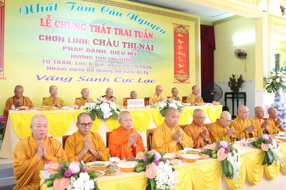 Cung đối trước chư Tôn đức Giáo phẩm, ĐĐ.Thích Phước Hoàng thay mặt Tang gia hiếu quyến có đôi lời hoài niệm về công ơn sanh thành nhân lễ Chung thất Cụ bà Châu Thị Nải, tác bạch cúng dường trai Tăng, tịnh tài vật lên chư Tôn đức hiện tiền Chứng minh nhằm hồi hướng cầu nguyện hương linh Cụ bà pháp danh Diệu Mỹ sanh về cõi an tịnh, làm tròn đạo hiếu của những người con Phật đối công ơn sanh thành dưỡng dục “Rộng như biển cả, Cao như núi thái sơn” đó là ông bà cha mẹ khi còn hiện tiền cũng như đã quá vãng.
