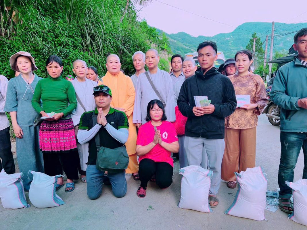 Đại diện đoàn có Ni sư Thích Nữ Cương Liên – Cố Vấn Phân Ban Ni Giới Trà Vinh; Ni sư Thích Nữ Trung Đạo – Trưởng Ban Từ Thiện Phân Ban Ni Giới Trà Vinh; Ni sư Thích Nữ Hoàng Liên – Ủy Viên Ban Hoằng Pháp Tỉnh Trà Vinh; cùng Chư Tôn Đức Ni và quý Phật tử đã tiếp tục tổ chức chương trình Hướng Về Miền Bắc Thân Thương gửi những phần quà đến cho bà con bị lũ lụt tại Thôn Sán Chải, Thôn Pìn Chải, Thôn Tạ Suối Câu, Thôn Ngã Thầu Hạ, Thôn Ngã Thầu Thượng,Thôn A Lầu 1, Thôn Cán Cấu, Thôn Chin Chu Lìn, Thôn Khu Chu Lìn, Huyện Bát Xát Tỉnh Lào Cai, chia sẻ 600 phần quà. Mỗi một phần quà gồm: 10 kg gạo, bao thơ 400 nghìn đồng cùng Mùng mền, quần áo mới, thuốc & dầu gió gửi đến bà con ở 9 Thôn của huyện Bát Xát Tỉnh Lào Cai. Sau khi phát quà xong đoàn gửi tặng thêm 26 phần quà cho mỗi một nhà 800 ngàn và 10kg gạo.