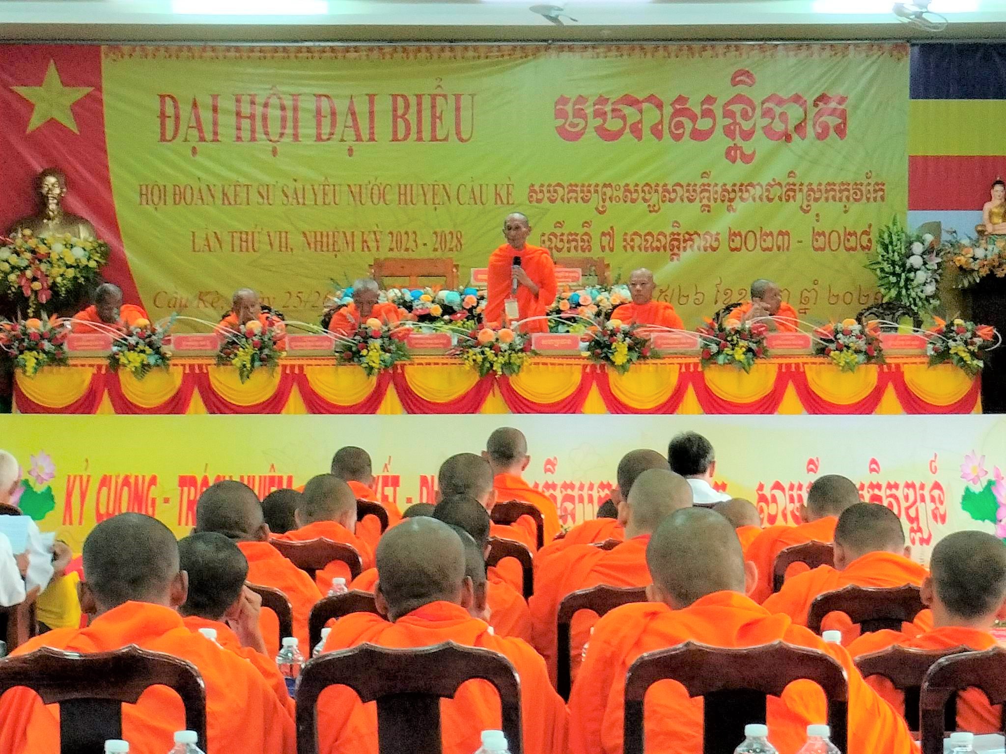 ĐĐ. Kim Thắng – Chánh văn phòng Hội ĐKSSYN huyện Điều phối chương trình, ĐĐ. Thạch Sa Thanh – Phó chủ tịch Hội ĐKSSYN huyện thông qua Quy trình làm việc Đại hội Đại biểu Hội ĐKSSYN huyện Cầu kè lần thứ VII, nhiệm kỳ 2023-2028. Tiếp đến, TT. Thạch Thảo – Chủ tịch Hội ĐKSSYN huyện khai thông mục đích yêu cầu phiên trù bị Đại hội, ĐĐ. Thạch Monh thông qua Báo cáo tổng kết nhiệm kỳ VI (2018-2023), huyện Cầu Kè có 22 chùa Phật giáo Nam tông Khmer và 486 chức việc quản trị. Hội ĐKSSYN huyện Cầu Kè với tinh thần hòa hợp, đoàn kết hiện hữu trong lòng dân tộc, vận động chư Tăng, Phật tử thực hiện đúng theo phương châm “Đạo pháp – Dân tộc – Chủ nghĩa xã hội”. Trong nhiệm kỳ qua đã đạt được một số kết quả về: Hoằng pháp, Tu học hành đạo, Giáo dục tổ chức mở được 86 lớp Sơ cấp Phật học có gần 1.400 Tăng thí sinh và 946 Achar giảng dạy, có 240 học viên Tốt nghiệp lớp Sơ cấp Phật học, Trung cấp Phật học 83 học viên,…