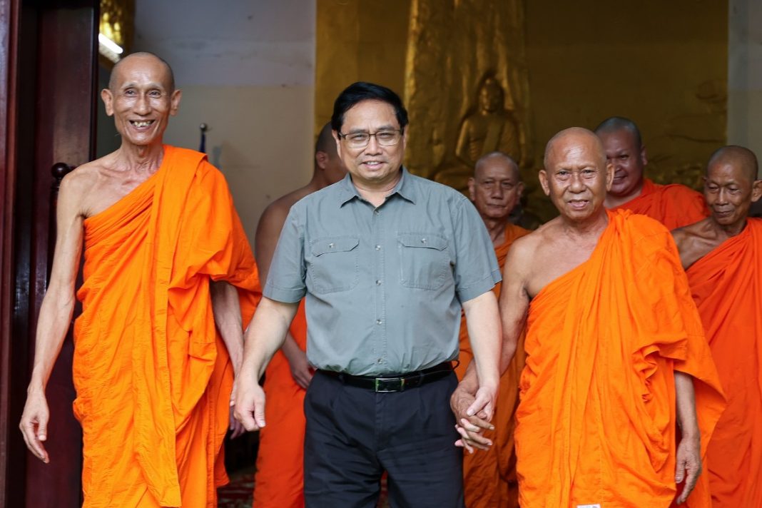 Thăm Hội Đoàn kết Sư sãi yêu nước tỉnh Trà Vinh tại chùa Ông Mẹt (còn gọi là Chùa Kom Pong) ở phường 1, Tp, Trà Vinh, Thủ tướng Phạm Minh Chính chuyển lời thăm hỏi, lời chào trân trọng, lời chúc mừng tốt đẹp nhất của Tổng Bí thư Nguyễn Phú Trọng và lãnh đạo Đảng, Nhà nước đến các vị chức sắc, chư Tăng, Phật tử phái Nam Tông Khmer, người có uy tín và đồng bào dân tộc Khmer.
