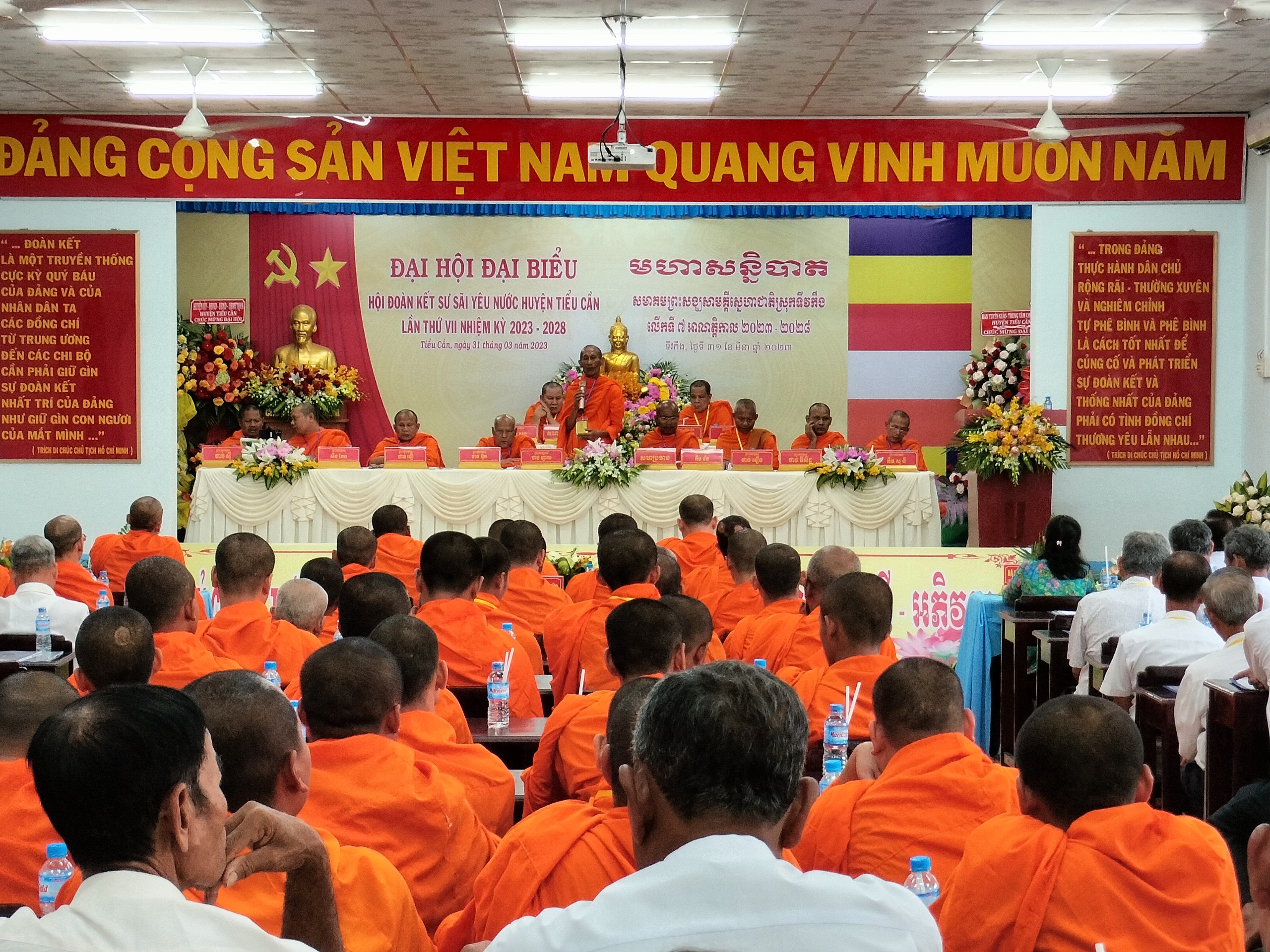 ĐĐ. Sơn Hòa – Phó chánh văn phòng Hội ĐKSSYN huyện điều phối chương trình, TT. Thạch Thưa – Phó chủ tịch Thường trực Hội ĐKSSYN huyện thông qua Quy chế đại hội. Tiếp đến, TT. Thạch Út – Chủ tịch Hội ĐKSSYN huyện khai thông mục đích yêu cầu phiên trù bị đại hội, ĐĐ. Kim Suôm Ươnl thông qua dự thảo báo cáo tổng kết nhiệm kỳ VI (2018-2023), huyện Tiểu Cần có 15 chùa Phật giáo Nam tông Khmer, có 329 chư Tăng và 131 Ban quản trị (BQT). Hội ĐKSSYN huyện luôn vận động chư Tăng, Phật tử thực hiện đúng theo phương châm “Đạo pháp – Dân tộc – Chủ nghĩa xã hội” làm tốt đời đẹp đạo, trong nhiệm kỳ VI đã đạt được một số kết quả về: Hoằng pháp, tu học hành đạo, giáo dục ngoài việc học lớp Sơ Trung cấp Phật học Pali – Khmer, có 9 vị Tăng sinh học trường Trung cấp Pali – Khmer tỉnh, 3 vị học tại Thái Lan, 4 vị tại TP.HCM,…