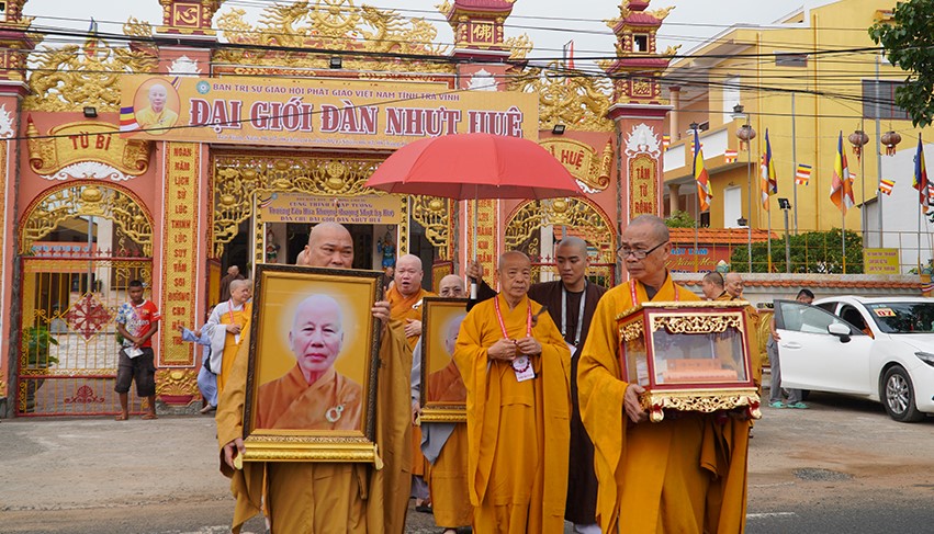 Đoàn cung nghinh dưới sự hướng dẫn của HT. Thích Trí Minh – Ủy viên HĐTS, Phó Trưởng ban Thường trực BTS GHPGVN tỉnh Trà Vinh, Trưởng ban tổ chức Đại giới đàn; HT. Thích Huệ Pháp – Ủy viên HĐTS, Phó trưởng BTS kiêm Trưởng ban Tăng sự GHPGVN tỉnh; TT. Thích Phước Hạnh – Phó trưởng BTS kiêm Trưởng ban Pháp chế GHPGVN tỉnh; TT. Thích Phước Nguyên – Phó trưởng BTS kiêm Trưởng ban Hoằng pháp GHPGVN tỉnh; TT. Thích Huệ Hùng – Trưởng ban Hướng dẫn Phật tử GHPGVN tỉnh cùng chư Tôn đức Hội đồng Thập sư Tăng, Ni và Ban Kiến đàn.